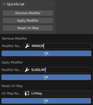 QuickScript is a simple add-on that I'll keep updating with useful scripts to speed up tedious tasks (that I run into when modelling for games).